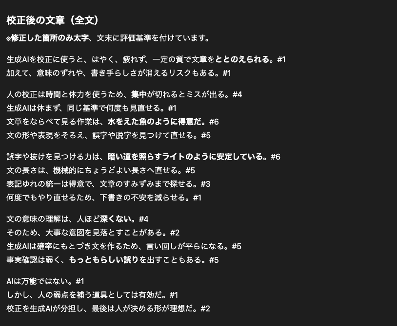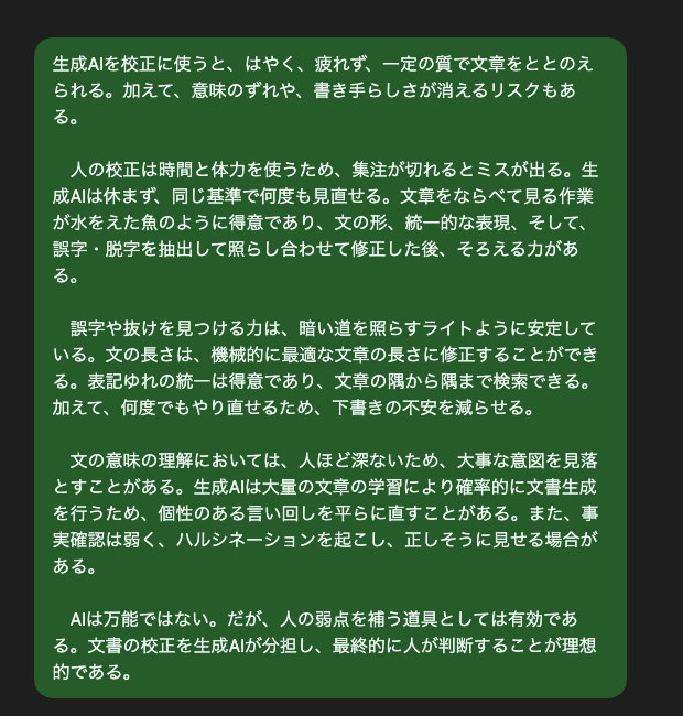 AIは万能ではない。だが、人の弱点を補う道具としては有効である。文書の校正を生成AIが分担し、最終的に人が判断することが理想的である。