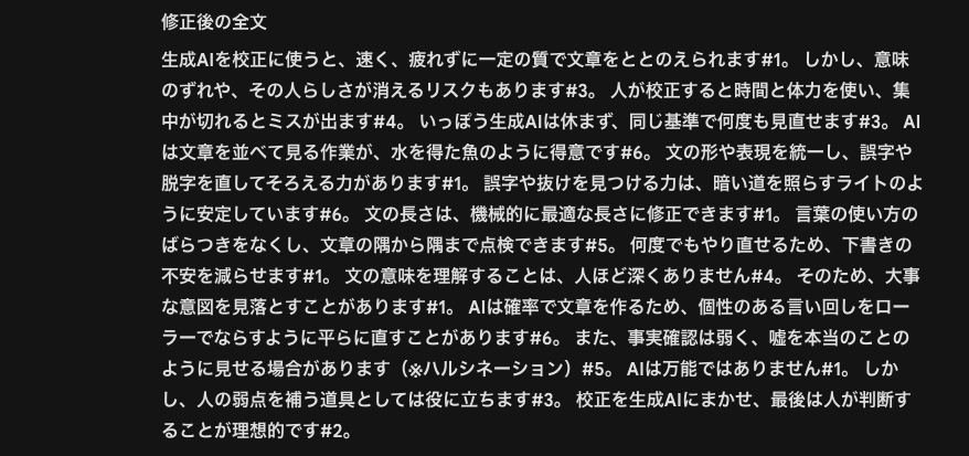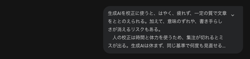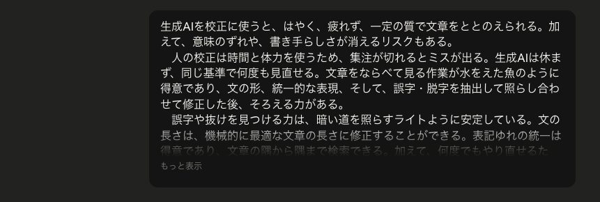 人の校正は時間と体力を使うため、集注が切れるとミスが出る。生成AIは休まず、同じ基準で何度も見直せる。文章をならべて見る作業が水をえた魚のように得意であり、文の形、統一的な表現、そして、誤字・脱字を抽出して照らし合わせて修正した後、そろえる力がある。